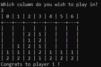 I made this game for a course project during my second semester at McGill. It is a simple connect-four game played via the command line against a CPU. I made it in Java using OOP. A cool feature about this game is that the CPU checks two moves ahead to see if it has a winning sequence, otherwise, its move is a deterministic function based on the previous move. This feature made the game surprisingly difficult to beat on the first few attempts, and it was a weird feeling struggling to beat a game that I created.